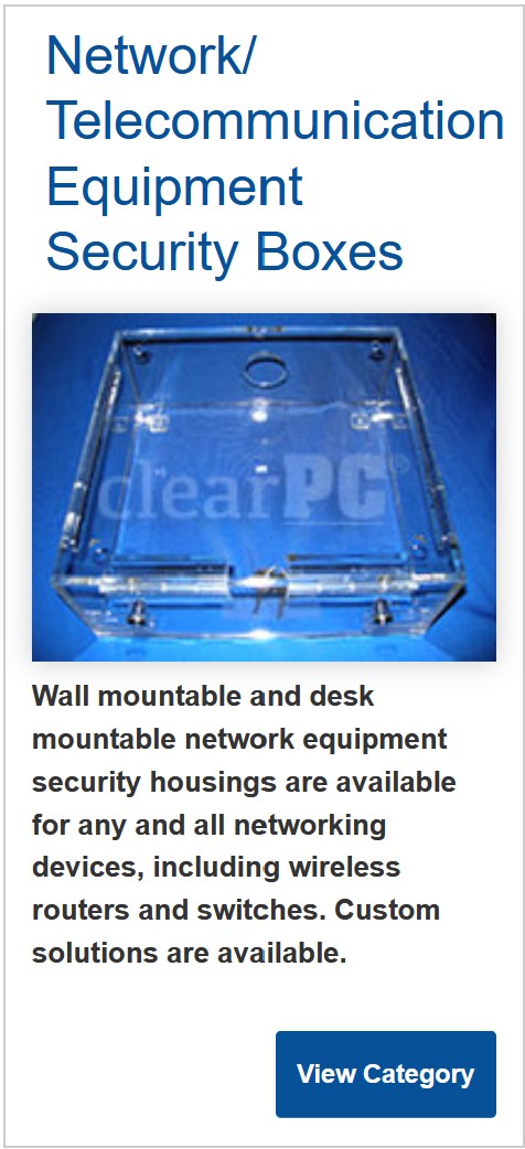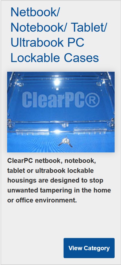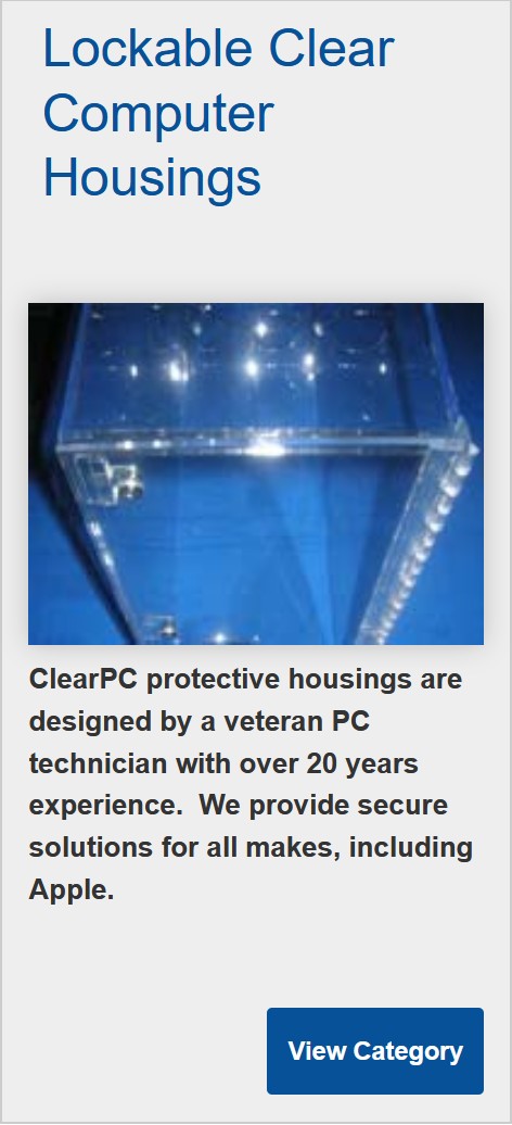 ClearPC® designs and manufactures clear Plexiglas® (acrylic) lock boxes, specializing in secure containers for electronics vulnerable to theft or tampering (i.e., 3D printers, Apple® IPADs). We will secure, cover or contain any item you can think of and 3d model it in 20 minutes. Shipping is available across the USA and Canada. Unlike our competitors, we are an actual manufacturer with a complete CNC machine shop, not just an on-line store. With in-house 3D modeling, we offer your business or organization inventive, unique solutions based on decades of experience. Feel free to email us about your next plastics project or call or text 250-888-9982 (8am to 8pm Pacific Standard Time) to talk directly to an A+® and Microsoft® Certified sales technician who can answer questions and direct you to the right solution. Thank-you.